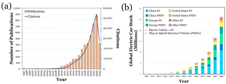 ( a ) Запись количества цитирований и публикаций, относящихся к LIB из EV с 1997 по июль 2023 года, полученная из Web of Science [ 17 ]. ( b ) Иллюстрация растущего мирового запаса EV и PHEV из IEA [ 18 ]. Это работа, полученная Ralls et al. из материалов IEA, и Ralls et al. несут исключительную ответственность и отвечают за эту производную работу. Производная работа не одобрена IEA каким-либо образом, полученным из.