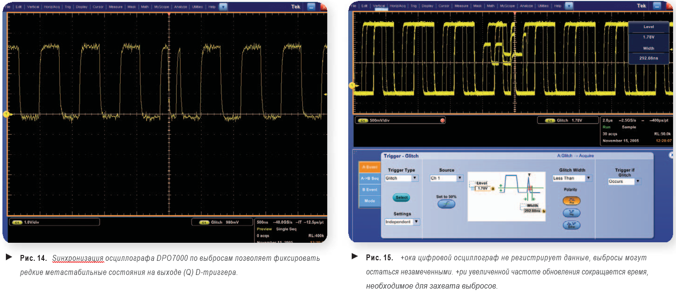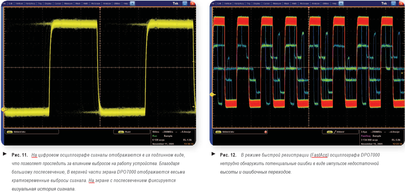 При неправильной работе схемы разумно будет начинать отладку с поиска выбросов. Bтобы рассмотреть выбросы, рекомендуется сравнить аналоговое и цифровое представления сигнала на цифровом осциллографе. Большинство неполадок проявляется