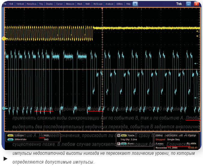 На рис. 13 триггер не может захватить данные, возвращающие его в предыдущее состояние. Хотя такие состояния не обнаруживаются с помощью обычной синхронизации, синхронизация по состояниям позволяет надежно фиксировать метастабильные состояния, в данном случае – переход к импульсу недостаточной высоты. В синхронизации по переходу и по импульсам недостаточной 1 высоты для захвата метастабильных сигналов используется условие двойного порога по амплитуде.