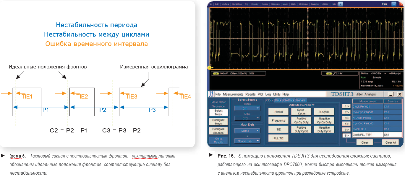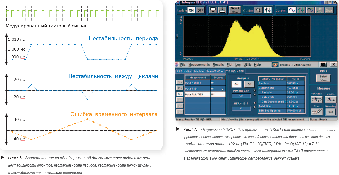 На схеме 6 сравниваются все три способа измерения нестабильности фронтов на одной осциллограмме. В этом примере номинальный период сигнала равен 1 мкс, а фактический изменяется