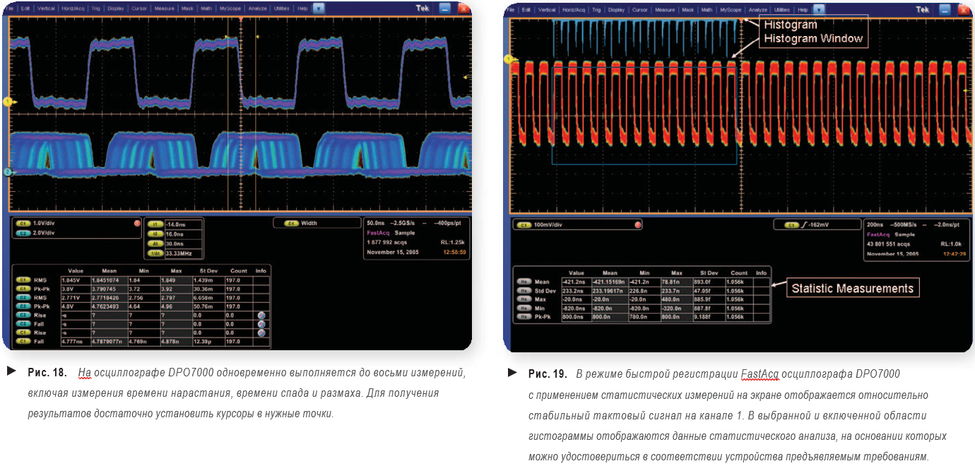 и использование возможностей осциллографа для выполнения задач отладки. После регистрации и сопоставления нескольких экранных измерений цифровой осциллограф отображает статистику и возможные отклонения по каждому из них.