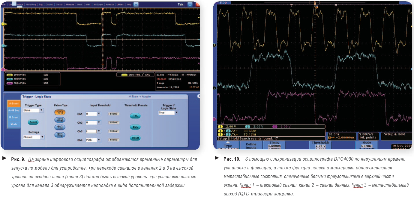 и фиксацию подобных явлений. Метастабильные состояния могут появиться из-за нарушений времени установки и фиксации на входе схем с защелками, схожих с D-триггером, осциллограммы которого изображены на рис. 10.