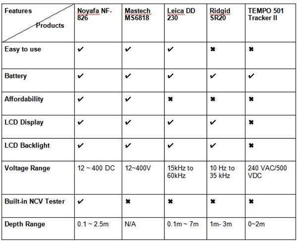 NF-826 — это доступный подземный и встраиваемый в стену трекер проводов, который дешевле, чем у конкурентов, таких как Leica DD 230 и Mastech. NF-826 состоит из передатчика, приемника, двух небольших портативных устройств со встроенными батареями для максимальной портативности.