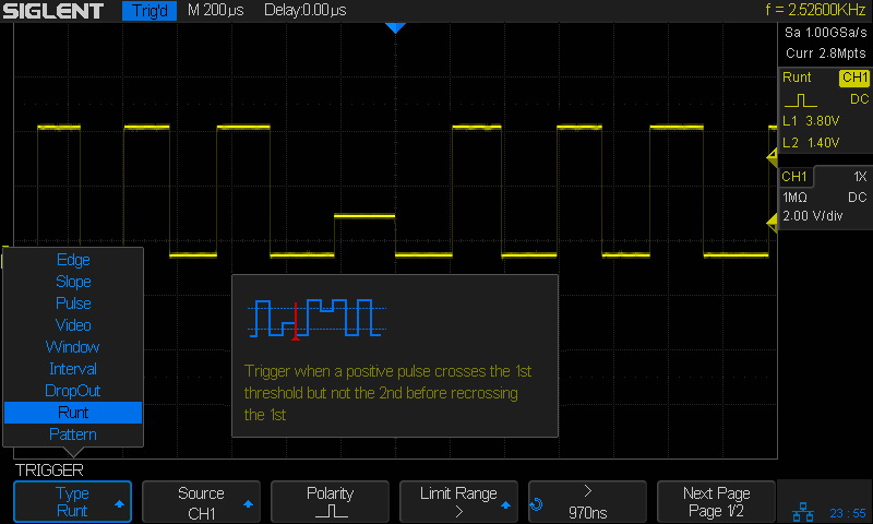 Расширенная система синхронизации предоставляет полноту возможностей по заданию условий захвата и синхронизации, в том числе сигналов IIC, SPI, UART/RS232, LIN, CAN. При выборе условий захвата на дисплее появляется окно с детальным графическим пояснением выбранного условия, что удобно для пользователя который только начинает работу с прибором.