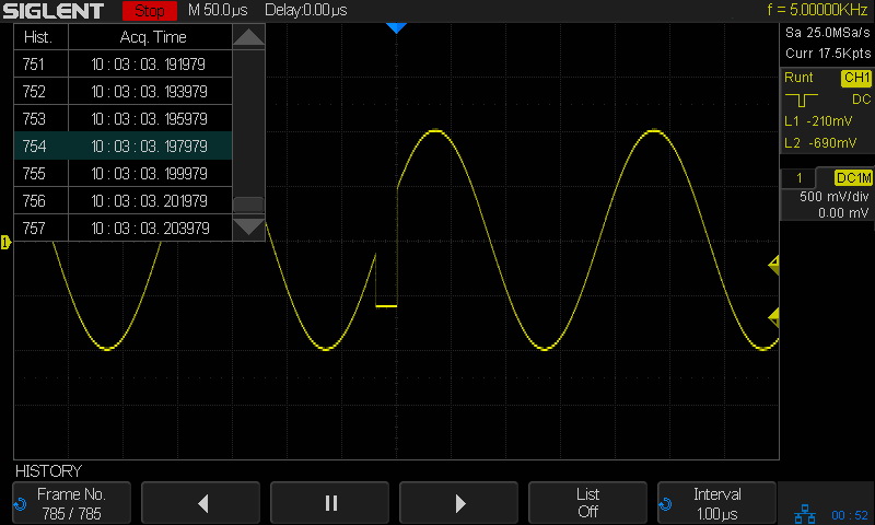 Функция регистратора позволяет выполнить запись во внутреннюю быструю память осциллографа с возможностью последующего просмотра осцилограмм.