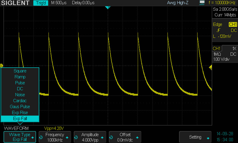 Формы сигналов  Sine, Square, Ramp, Pulse, DC, Noise, Cardiac, Gaus Pulse, Exp Rise, Exp Fall, Arb