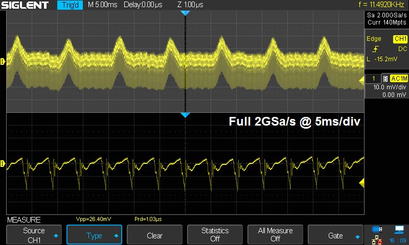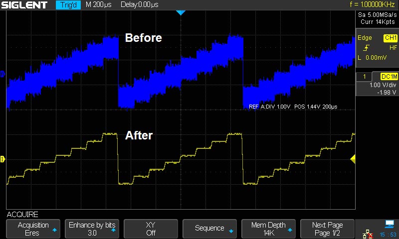 Режим выборки Eres позволяет существенно улучшить соотношение SNR вне зависимости от периодичности сигнала и стабильности триггера.