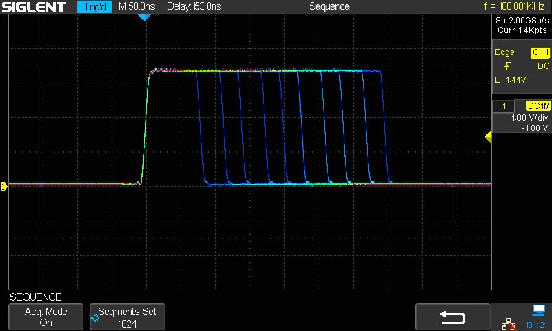 В режиме последовательной выборки на дисплее не отображается форма сигнала, тем самым достигается высокая скорость захвата осциллограмм.