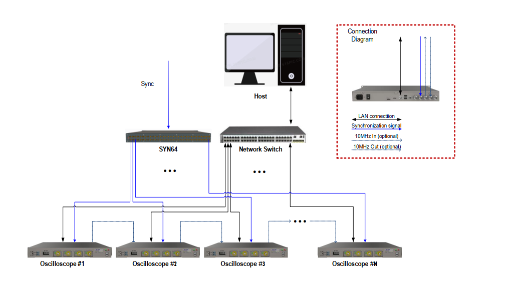 Его можно использовать как автономный осциллограф при подключении к внешнему дисплею и мыши. Им также можно управлять удаленно по локальной сети благодаря удобному встроенному веб-серверу. В сочетании с 64-канальным распределителем синхронизации (SYN64) несколько модулей SDS6000L могут быть организованы в высокоскоростную систему сбора данных, содержащую до 512 каналов. Полный набор команд SCPI через стандартное соединение 1000M LAN обеспечивает очень быстрый сбор данных для ускорения приложений автоматического тестирования.