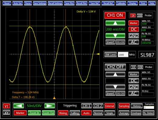 Рис.1: Синусоида 5 МГц на осциллографе.