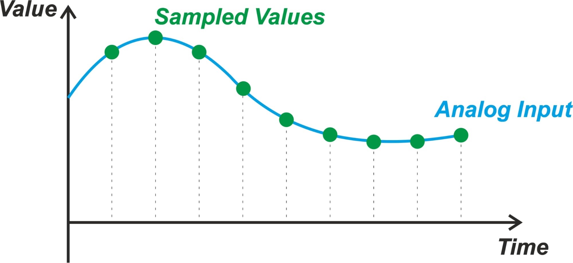 этом рисунке аналоговый вход (синяя кривая) принимает разные значения во