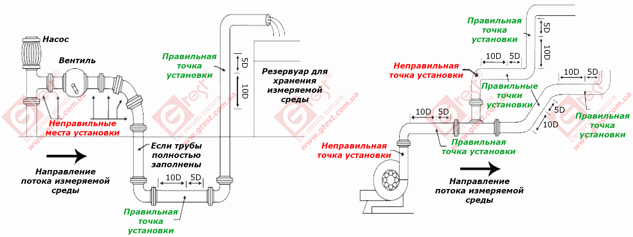 - Труба должна находиться далеко от выпускного отверстия насоса и полуоткрытого клапана. 10D в восходящем направлении и 5D в нисходящем. (D означает внешний диаметр)