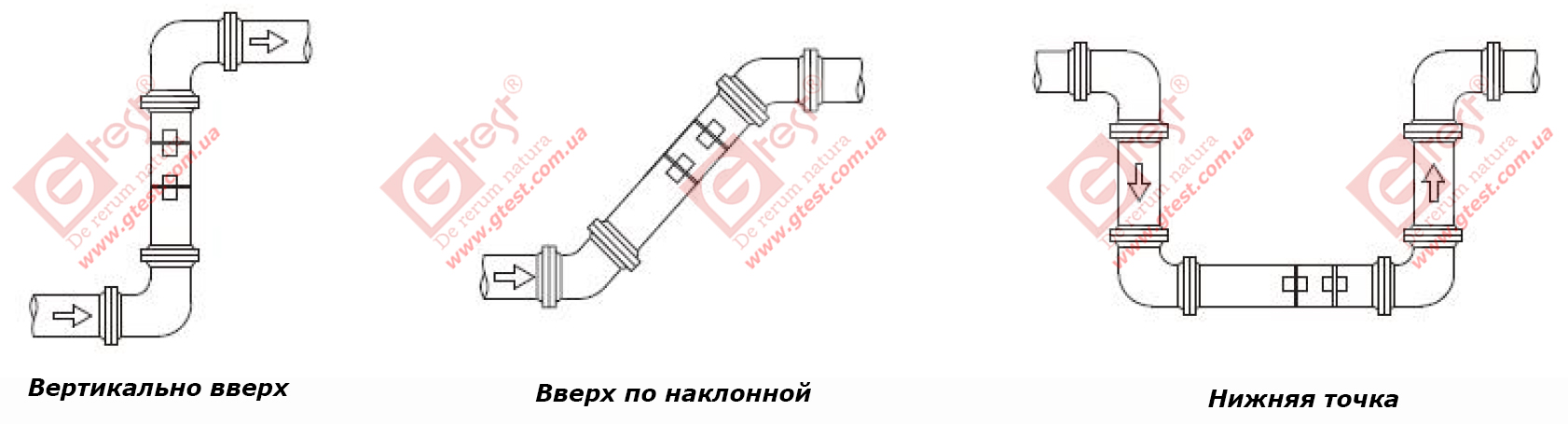 | Прямолинейный участок | 10D до первого датчика (UP), 5D от второго датчика (DOWN), 30D от насоса. | |