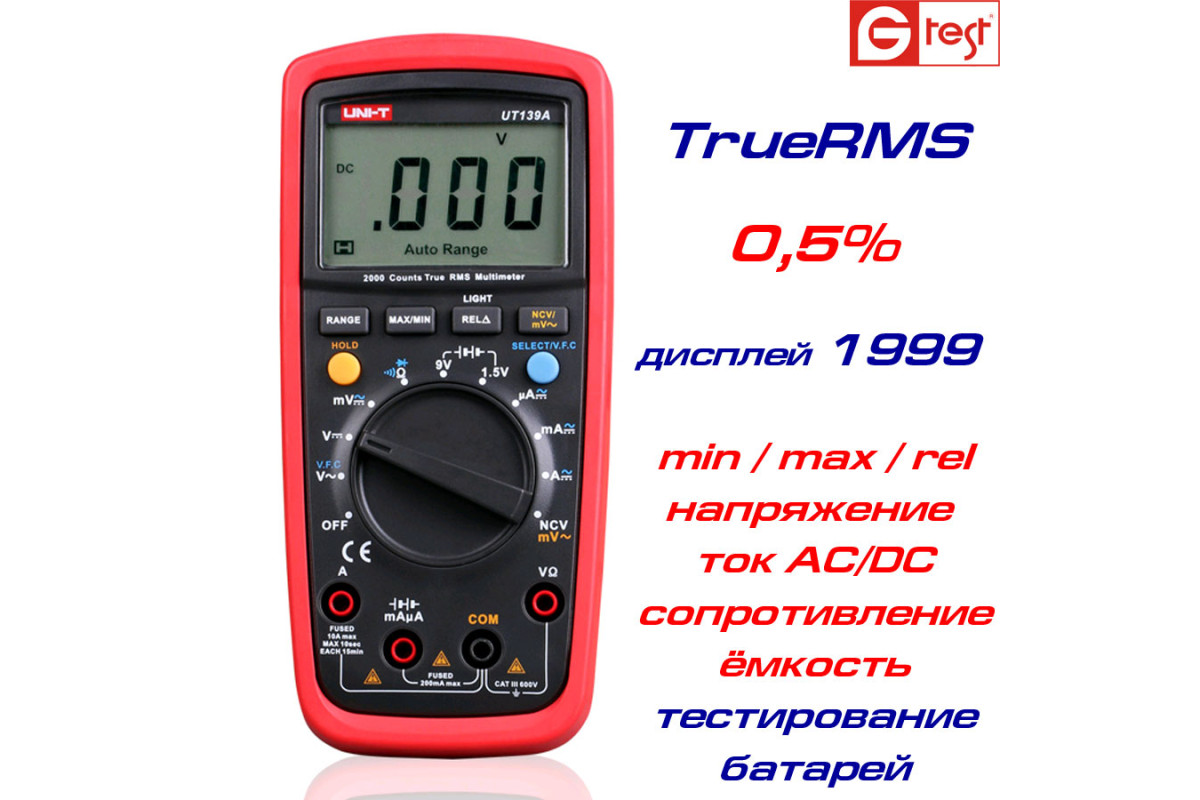 UT139A - имеет LCD дисплей на 2000 отсчетов, реализована функция измерения переменного напряжения и тока с полосой 400 Гц, тестирования батарей.