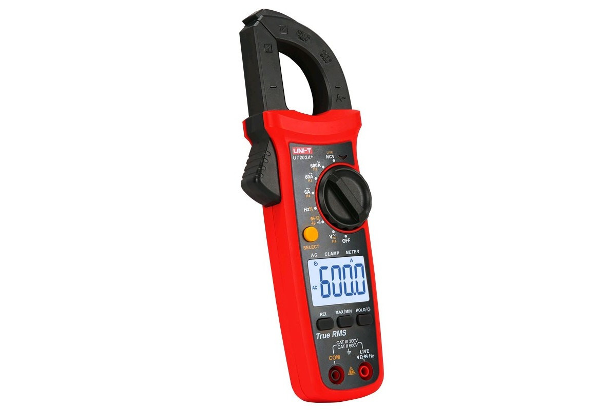 UNI-T UT202A+ - обновленная версия токоизмерительных клещей UT202A производства компании UNI-T предназначена для измерения переменного тока до 600A (в поддиапазонах: до 6 А, 60 А и 600 А), с функциями мультиметра: измерение АС/DC напряжения до 600 В, сопротивления до 60 МОм, емкости до 60 000 мкФ, частоты до 10 МГц, а также тестирование диодов и проверка цепи на проводимость. Токовые клещи UT202A+ имеют функцию True RMS, функцию Live wire test – определения фазного провода и функцию NCV – бесконтактного детектирования высокого напряжения. Это надёжный и точный инструмент при измерении тока, напряжения, сопротивления, емкости, тестировании диодов и прозвонки целостности цепи.
