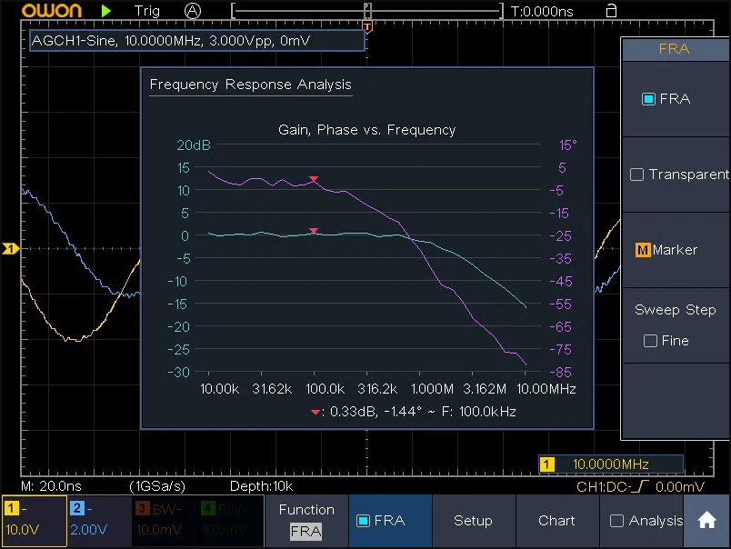 Серія XDS4000 може генерувати сигнал розгортки зазначеного діапазону, керуючи вбудованим модулем генератора сигналів і виводити сигнал на джерело живлення комутатора для проведення аналізу петлі. Діаграма Боде, згенерована в результаті тесту, може відображати зміни посилення та фази системи на різних частотах, дозволяючи інженерам отримати чітке уявлення про дані з діаграми Боде. Аналізуючи запас фази (PM) і запас посилення (GM), вони можуть судити про стабільність системи.
