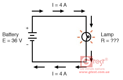 R = E/I = (36 V) / (4 A) = 9 Ω