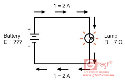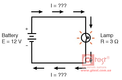 третьей. В этом первом примере мы рассчитаем величину тока (I) в цепи, учитывая