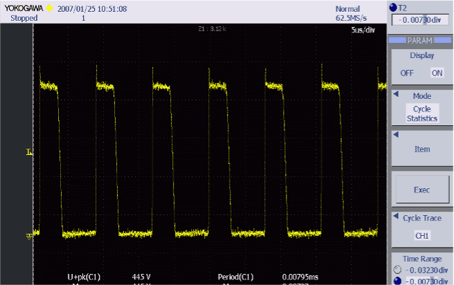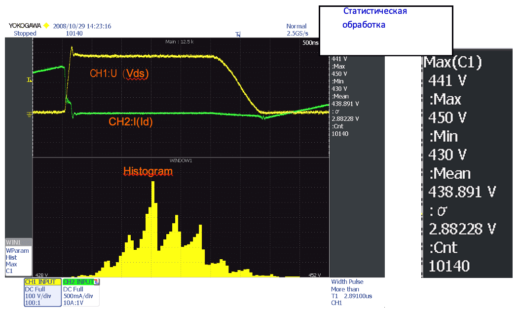 Перенапряжение, которое генерируется коммутационными элементами, должно оставлять запас по сравнению с номинальным напряжением. Чтобы подавить перенапряжение, инженеры будут регулировать детали, наблюдая за формами волн и потерями одновременно. Серия DLM2000/DL9000 наблюдает за формами волн переключения, чтобы измерить пик перенапряжения. Максимальное, минимальное, среднее и стандартное отклонение рассчитывается с помощью статистической функции. Что касается его распределения, можно проверить рассеивание на гистограмме. Кроме того, длинная память имеет достаточное временное разрешение для коммерческих частот и может захватывать даже редкие низкие пиковые значения.
