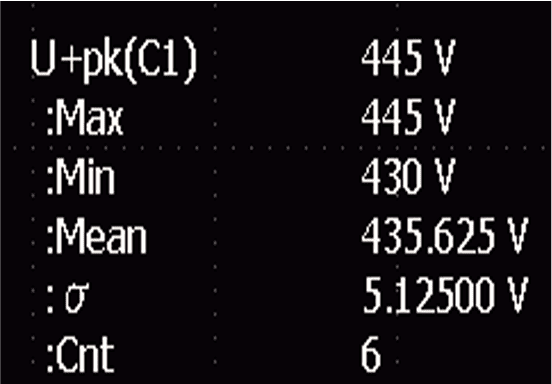 В примере на рисунке 22 измеряется шесть циклов формы волны Vds, и статистика циклов для максимального напряжения перенапряжения (параметр: U+pk) вычисляется для каждого цикла переключения. Максимальное, минимальное и среднее значение циклов были вычислены как 445 В, 430 В и 435,625 В соответственно.