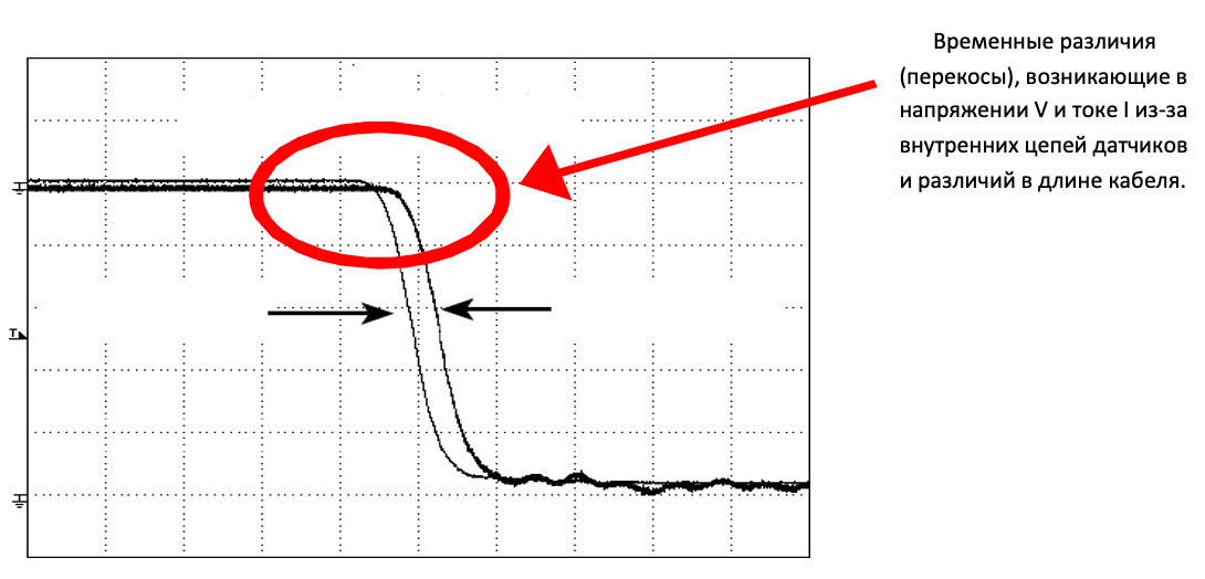 Временные различия (перекос), возникающие в напряжении V и токе I из-за внутренних цепей зондов и различий в длине кабеля. Дифференциальные зонды необходимы при измерении напряжения Vds между источниками стока с помощью осциллографов, поскольку коммутационные элементы имеют плавающие соединения.