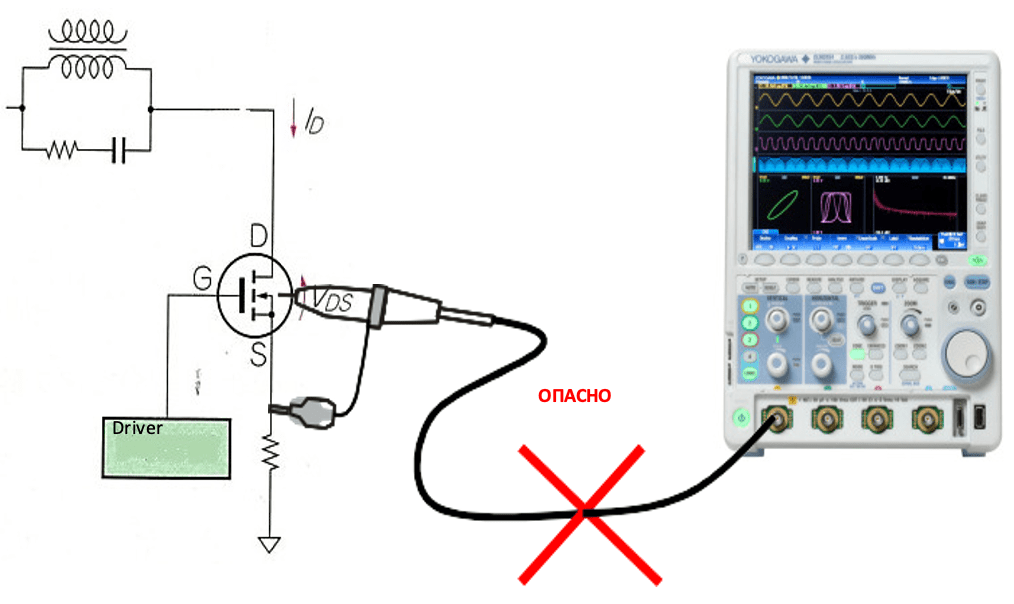 Заземление осциллографов такое же, как заземление, используемое в шасси. Опасно подключать заземляющий провод зонда к любой клемме в МОП-транзисторе, так как это приведет к короткому замыканию на землю через осциллограф.