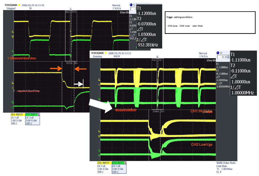 Инверторы имеют переключатели высокой и низкой стороны. Когда оба переключателя включены одновременно, возникают электрические потери с потоком больших сквозных токов. Переключатели включаются попеременно во время простоя. Более короткое время простоя может уменьшить количество потерь, однако динамический запас уменьшается, что увеличивает риск возникновения сквозных токов. Серии DLM2000/DL9000 наблюдают за формами сигналов Vgs высокой и низкой стороны, чтобы проверить, является ли время простоя ненормальным.