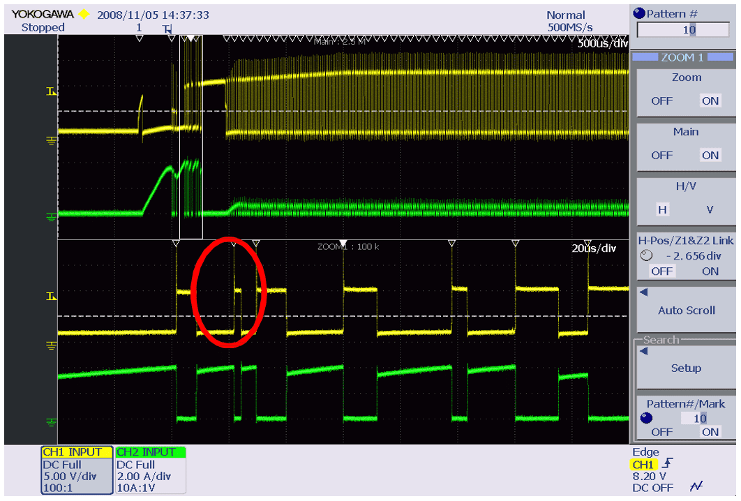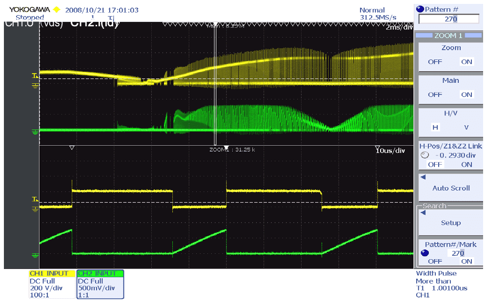 Необходимо проверить переходный процесс динамики переключения при запуске, во время выключения, состоянии коротких замыканий и выключения нагрузки, а также резких изменениях нагрузки. Возможно, что цепи могут выйти из строя, когда происходят импульсные блоки и пропуски переключения. Для проверки переходного процесса форма сигнала переключения фиксируется в условиях длительной и высокой выборки и увеличивается на каждый импульс переключения, чтобы проверить, есть ли какие-либо аномальные формы сигнала. Аномальные формы сигнала можно искать мгновенно с помощью функции поиска богатых форм сигнала. Кроме того, ошибки импульса можно найти путем статистической обработки основных параметров (ширины импульса) с помощью статистической функции цикла. Кроме того, это удобная функция, поскольку область может быть автоматически увеличена по времени для отображения путем прокрутки для подтверждения и оценки.
