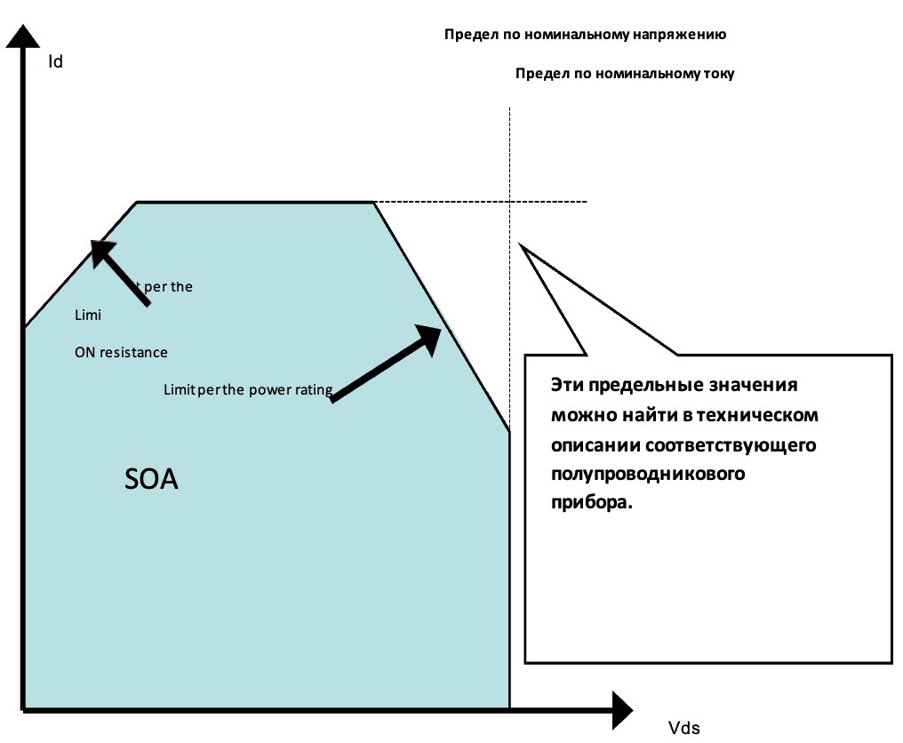Чтобы повысить надежность цепей импульсного источника питания, инженеры должны подумать, как заставить силовое устройство работать в рабочих границах. Для этого на графике X-Y отображается соотношение между напряжением и током для оценки характеристик активной области устройства. В случае MOSFET силовое устройство работает в пределах безопасной рабочей зоны (SOA), показанной на рисунке 30 (область под линиями). Точки измерения те же, что и на рисунке 5.