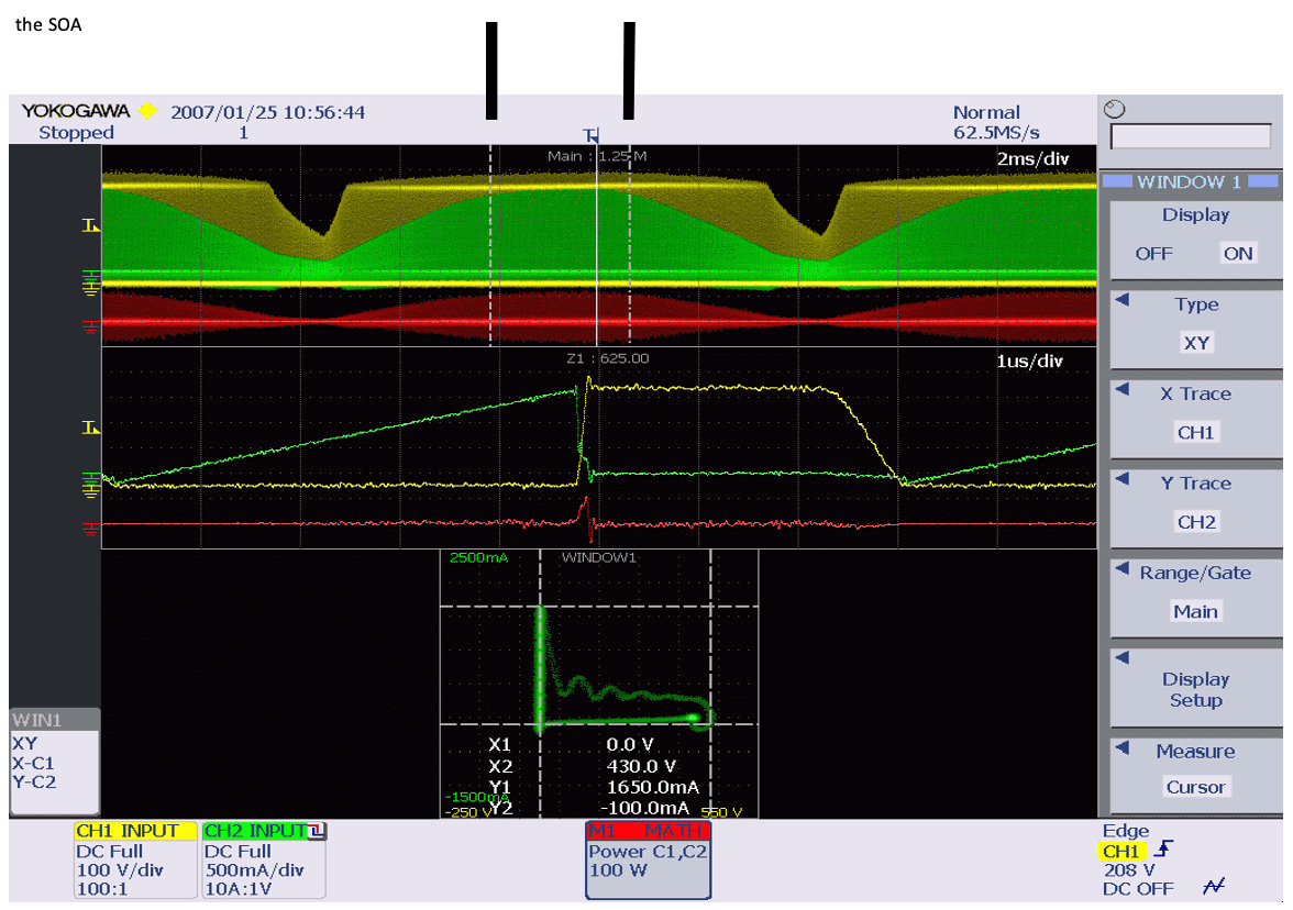 В DLM2000/DL9000 уровни берутся из CH1 (Vds) для оси X и формы сигнала CH2 (Id) для оси Y. SOA можно подтвердить, посмотрев на корреляцию между двумя уровнями входного сигнала. Возможно одновременное наблюдение за формами сигнала X-Y и обычными формами сигнала T-Y (отображение формы сигнала с использованием оси времени и уровня). Кроме того, поскольку вы можете поместить курсор в произвольное место на отображаемой форме сигнала SOA, чтобы прочитать его значение, вы можете легко проверить, находится ли уровень в пределах.