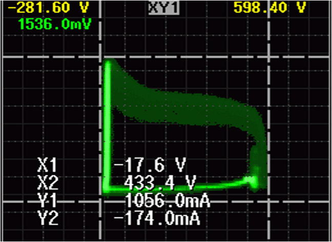 В DLM2000/DL9000 уровни берутся из CH1 (Vds) для оси X и формы сигнала CH2 (Id) для оси Y. SOA можно подтвердить, посмотрев на корреляцию между двумя уровнями входного сигнала. Возможно одновременное наблюдение форм сигнала X-Y и обычных форм сигнала T-Y (отображение формы сигнала с использованием оси времени и уровня). Кроме того, поскольку вы можете поместить курсор в произвольное место на отображаемой форме сигнала SOA, чтобы прочитать его значение, вы можете легко проверить, находится ли уровень в пределах.