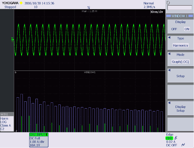 С помощью DLM2000/DL9000 можно вычислить гармоники, излучаемые тестируемым устройством, определенные стандартом IEC61000-3-2 для каждого применимого класса (A–D), а результаты можно отобразить на гистограмме или в списке, сравнивающем предельные значения гармонического тока с вычисленными значениями. При проверке совместимости стандартов его можно использовать для отладки цепи с высокими гармониками (PFC: коррекция коэффициента мощности).
