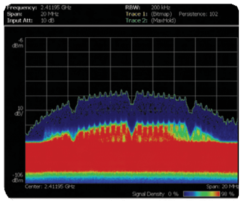 Революционная технология отображения DPX позволяет обнаружить то, что другие анализа торы упускают. На рисунке показаны сигналы, которые точка доступа и терминал WLAN передают с разным уровнем мощности. Частота появления сигналов отображается с помощью цветовой градации. Из рисунка видно, что выделенный красным цветом сигнал точки доступа появляется чаще, чем выделенный синим сигнал терминала.