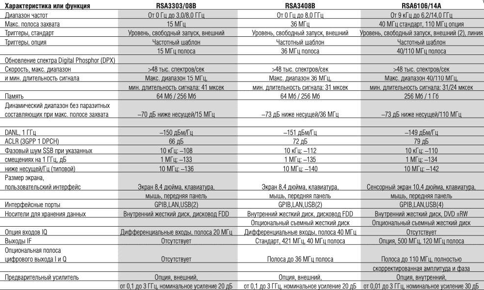 Tektronix предлагает модели анализаторов спектра реального времени, которые удовлетворяют ряду требований: полоса рабочих частот, полоса частот реального времени и динамический диапазон. В приведенной далее таблице указаны общие краткие сведения о различиях между моделями. Подробные данные по моделям RSA3300B и RSA6100A можно получить в отдельных технических спецификациях.