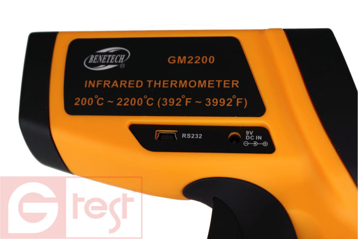 GM2200 бесконтактный инфракрасный термометр производства компании Benetech предназначен для бесконтактного, быстрого и чрезвычайно точного измерения температуры поверхностей.GM-2200 способен обеспечиваеть  измерение температуры до 2200 ºC. Особеннностями пирометра GM-2200 являются: оптическое разрешение 80:1, RS232 интерфейс для анализа данных с помощью ПК, возможность установки коэффициента излучательной способности, функция сохранения и воспроизведения данных измерений, функции индикации низкого заряда батареи и автоматического выключения при длительном бездействии прибора. Также GM-2200 оснащён дополнительной функцией удерживания результатов измерения на дисплее, функцией отображения максимального/ минимального/среднего значения и разницы значений температуры поверхности, функцией выбора единиц измерения, функция звукового предупреждения при достижении установленых значений температуры.