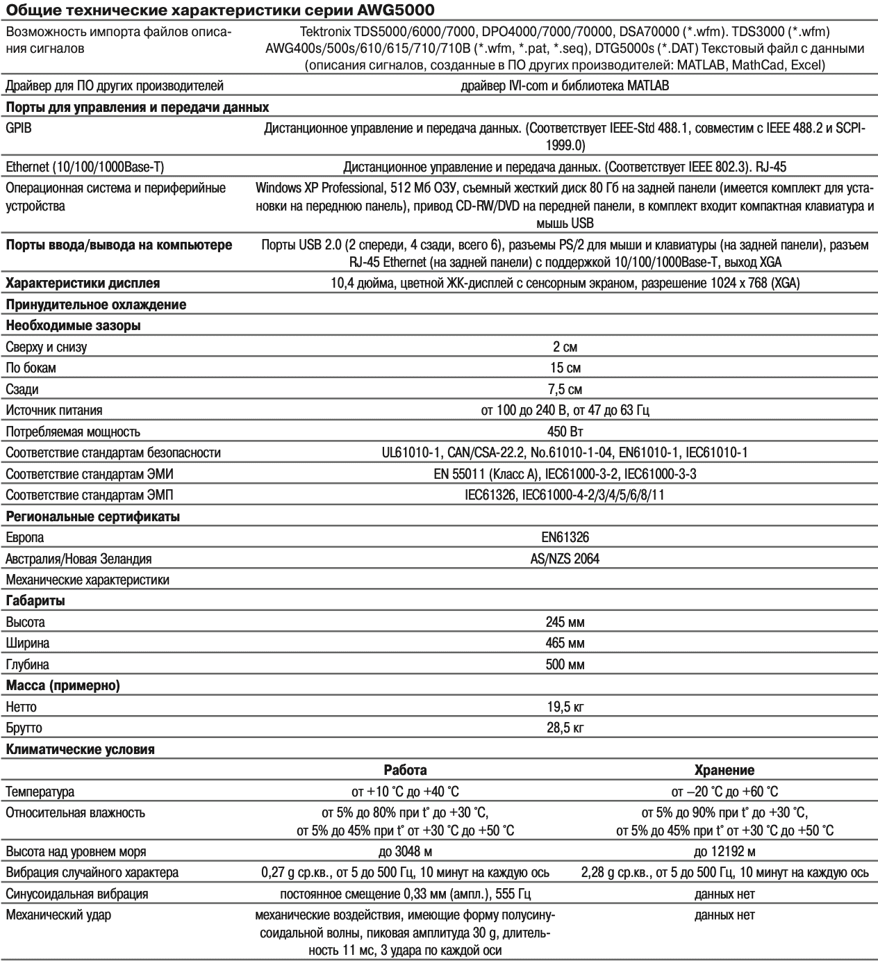 В комплект каждой модели входит: сумка для принадлежностей, передняя крышка, мышь USB, компактная клавиатура USB, комплект кабелей для выхода постоянного напряжения, перо для сенсорного экрана (2 шт.), DVD с резервной копией операционной системы Windows XP и инструкциями, CD с прикладными программами для приборов серии AWG5000 и инструкциями, CD с документацией и программой просмотра, краткое руководство пользователя, регистрационная карта, сертификат калибровки, кабель питания.