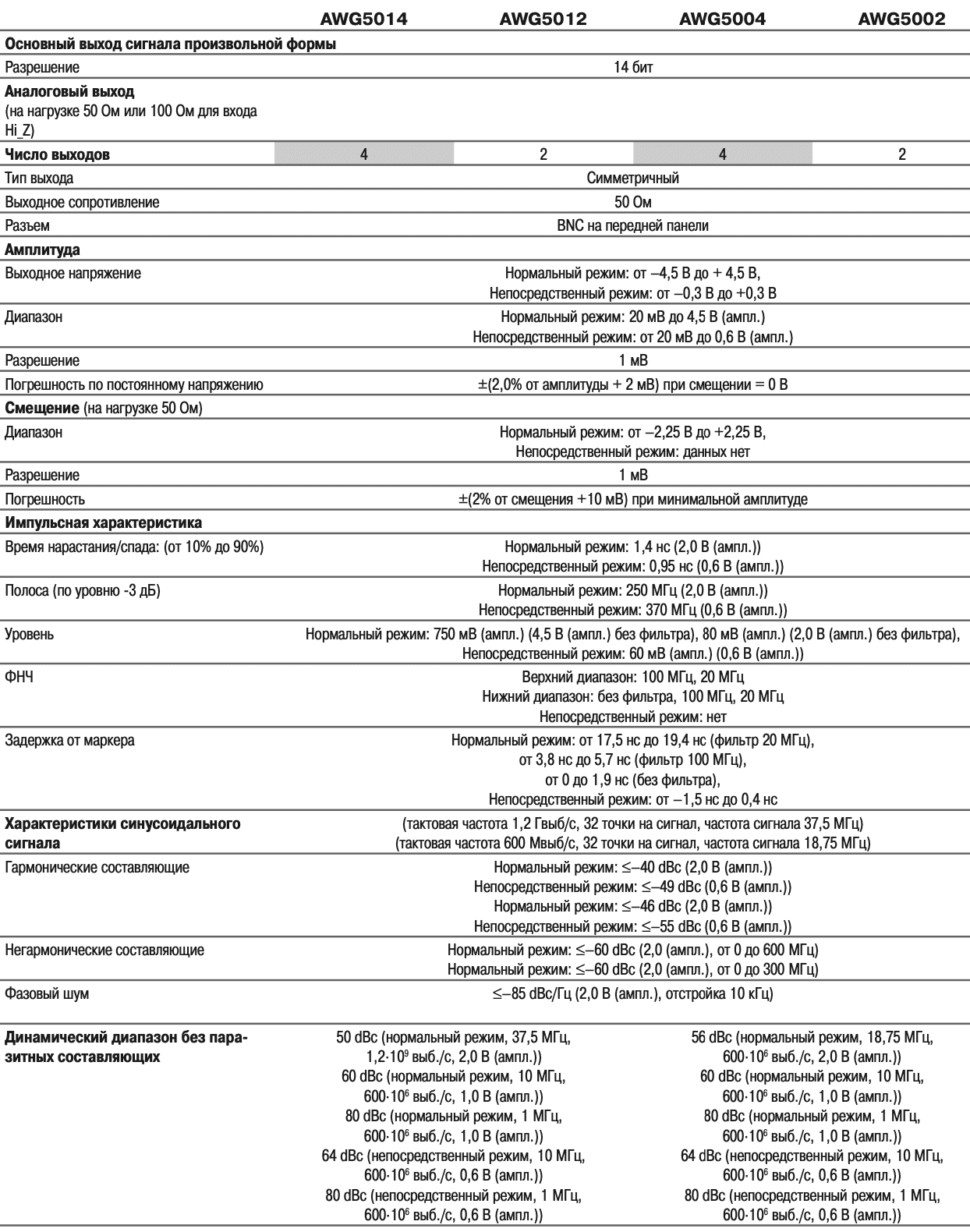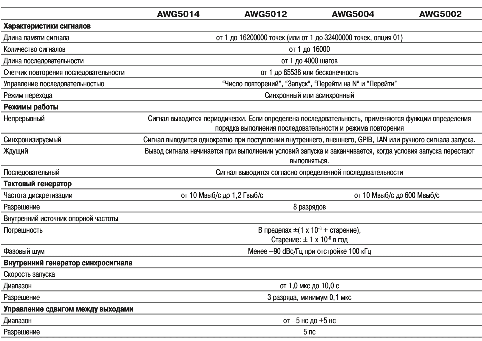 Модели серии AWG5000 оборудованы 14-разрядным ЦАП с частотами дискретизации от 600 млн. до 1,2 млрд. выборок в секунду, имеют от 2 до 4 каналов, могут синхронизировать от 4 до 8 выходов цифровых маркеров и имеют 28 каналов для вывода цифровых данных, что позволяет с легкостью решать сложнейшие измерительные задачи в сфере беспроводных коммуникаций, в ходе разработки бытовых цифровых устройств (например, устройств формирования изображения), преобразователей данных и полупроводниковых компонентов.