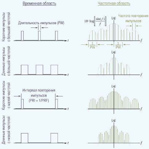 Таким образом, длительность импульса влияет на два важных свойства радиолокационной системы – разрешение и дальность обнаружения. К сожалению, эти два качества связаны обратной зависимостью. Более длительные импульсы соответствуют радиолокаторам с большей дальностью обнаружения и меньшим разрешением, в то время как более короткие импульсы соответствуют радиолокаторам с лучшим разрешением, но меньшей дальностью. Кроме того, чтобы правильно сгенерировать и получить короткие импульсы, необходимо обеспечить большую полосу пропускания. Это обстоятельство привлекает интерес к характеру спектра импульса. Характеристики временной области импульса, естественно, имеют свои эквиваленты в частотной области. Ширина спектра короткого импульса больше, чем импульса с большей длительностью. Аналогично, при более высокой частоте следования импульсов (PRF) промежутки между спектральными компонентами больше, чем при низкой частоте следования импульсов.