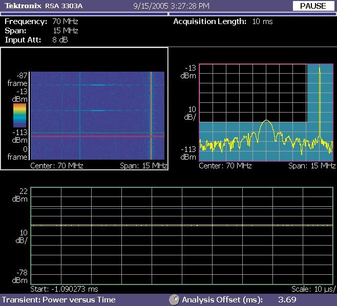 Анализатор RSA3408A обеспечивает захват сигналов с полосой частот 36 МГц. В режимах отображения мощности по времени, при оптимизации фильтров для измерений во временной области, анализатор RSA3408A обеспечивает разрешение 20 нс. Это позволяет анализировать очень короткие импульсы и подробно исследовать их форму.