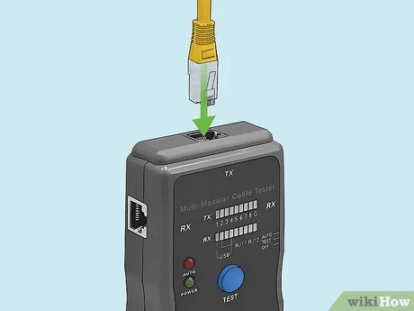 - Вставьте один конец кабеля в разъем TX на тестере. Это порт вставки. Вставьте любой конец кабеля в этот порт до щелчка.