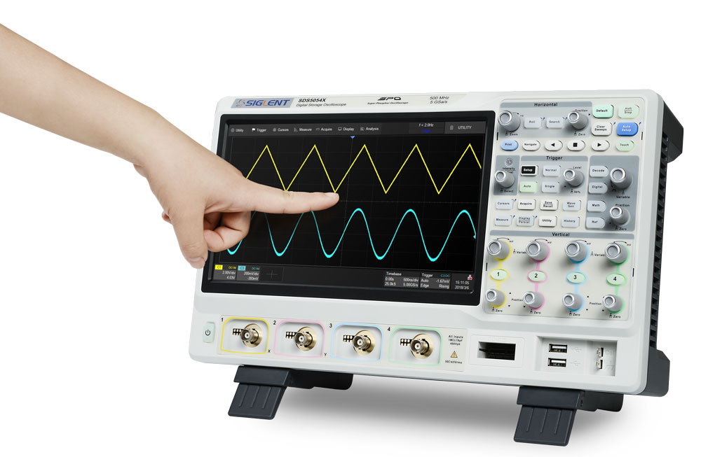 SDS5000х также предлагает впечатляющий набор измерительных и математических возможностей, опции для генератора сигналов произвольной формы с частотой 25 МГц и декодирование. Емкостный сенсорный экран с диагональю 10,1 дюйма, поддерживающий жесты с несколькими касаниями, с добавлением удобного одноклавишного дизайна для наиболее часто используемых функций может значительно повысить эффективность работы SDS5000х. Осциллограф также поддерживает управление мышью и внешней клавиатурой.