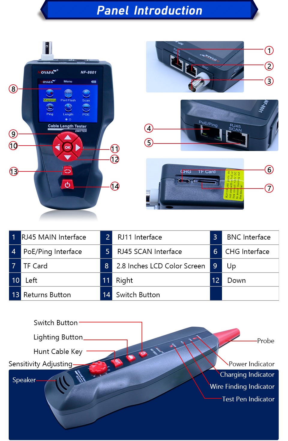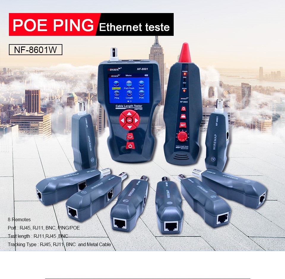 Это многофункциональное устройство, применяемое для измерения длины провода, трассировки линии и поиска обрыва в проводе, PING-тестов, выполнения проверок на наличие POE и напряжения в проводе. Оператор может наблюдать результаты тестирования на цветном дисплее с размером диагонали 3.7 дюйма (94 мм).