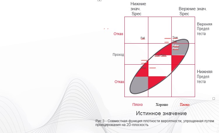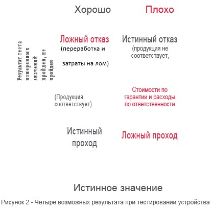 Матрица на рисунке 2 показывает возможные результаты испытаний и реальные результаты измеренного значения в сравнении с истинным значением ИУ. Он используется для визуализации четырех возможных результатов теста: ложный отказ, ложный проход, истинный проход и истинный отказ.