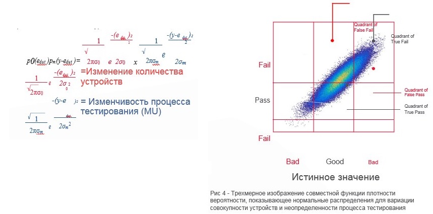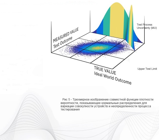Совместная функция плотности вероятности включает изменение совокупности устройств и неопределенность процесса тестирования. Вариация совокупности устройств - это нормальное распределение под колоколообразной кривой, при этом пределы тестирования обычно устанавливаются на уровне достоверности 95 проц. Устройства, что «прошли», можно считать как положительный «доход». Изменчивость процесса тестирования - это MU всей тестовой системы. Уравнение JCGM можно применять как от простой, так и от сложной системы тестирования, поскольку несколько единиц составляют общую сумму. На рисунке 5 показаны совместные функции плотности вероятности в трех измерениях. Колоколообразные кривые показывают нормальное распределение выхода вариаций совокупности устройств и изменчивость процесса испытания. На диаграмме разброса наибольшая концентрация данных отображается желтым цветом, а наименьшая - фиолетовым.