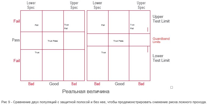 На рис. 3 показаны четыре результата - ложный отказ, ложный проход, истинный проход и истинный отказ - в упрощенном двумерном графике. Истинное значение отображается по оси x и представляет DUT. Ранее это описывалось как вес на весах.