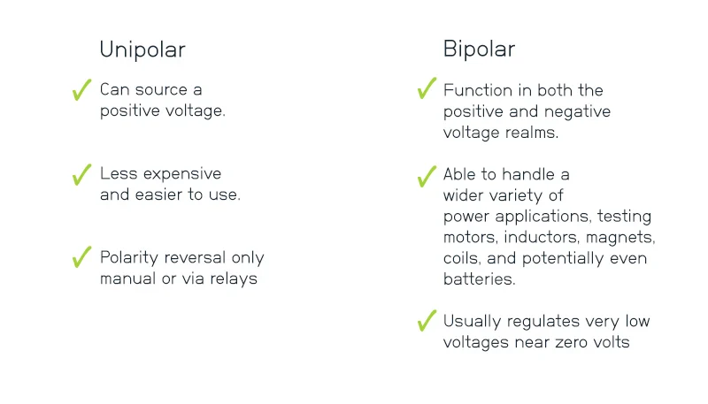 Униполярный источник питания способен вырабатывать только положительное напряжение. Инженер технически может переключить выводы, подключенные к источнику питания, для получения отрицательного напряжения, но биполярные источники питания работают как в области положительного, так и отрицательного напряжения. Биполярные источники питания способны работать в более широком спектре областей применения, но они более дороги и сложны в эксплуатации, поэтому многие инженеры выбирают униполярный источник питания для систем постоянного тока.