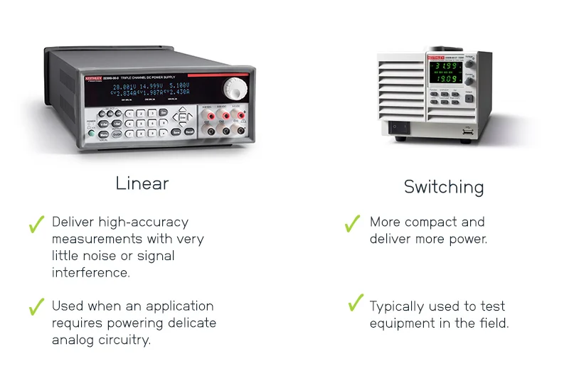 Линейный источник питания обеспечивает высокоточные измерения с очень низким уровнем шума и минимальными помехами. Однако они, как правило, тяжелее, больше по размеру и обеспечивают меньшую мощность и меньшую эффективность. Импульсные источники питания, напротив, компактнее и обеспечивают большую мощность, но, как правило, имеют высокочастотный шум и менее точные измерения. Импульсный источник питания часто используется, когда важна плотность мощности, поскольку позволяет получить значительно большую мощность при малых габаритах, тогда как линейный источник питания используется, когда требуется питание чувствительных аналоговых схем.