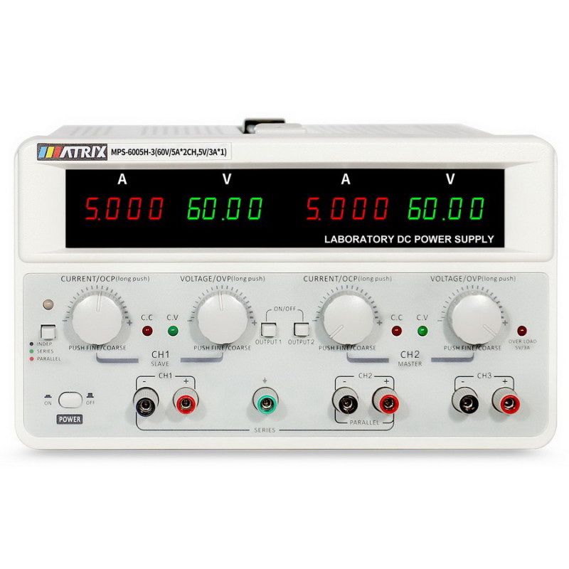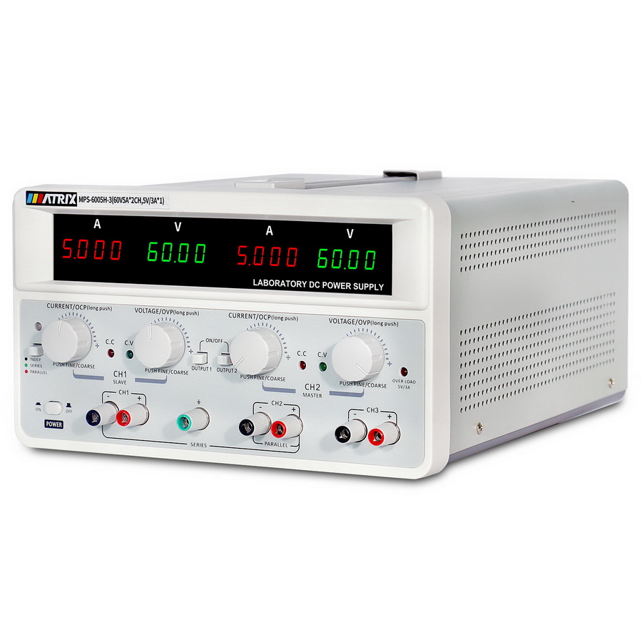 MPS-3003H-3 и MPS-3005H-3 - представители новой серии источников питания имеет два независимых регулируемых канала, работающих в режиме стабилизации тока или напряжения, а также в последовательном, параллельном или независимом режиме, и один независимый канал с фиксированным напряжением 5 В и максимальным допустимым током нагрузки 3 А. Отличительной чертой блоков питания этой серии является одновременное отображение тока и напряжения с помощью двух 4-х разрядных светодиодных индикаторов, разрешение 10 мВ / 1 мА, точность по напряжению 0,03% +10мВ, точность по току 0,1% +5 мА, все потенциометры заменены кодированными переключателями, обладающими высокой надежностью и длительным сроком работы, низкий температурный дрейф установленных параметров, низкий уровень шумов и пульсаций, а также встроенная защита от короткого замыкания. Величины напряжения и тока в последовательном и параллельном режимах отображаются на экране без необходимости дополнительных расчётов, грубая и точная регулировка напряжения и тока могут осуществляться через нажатие на соответствующую клавишу.