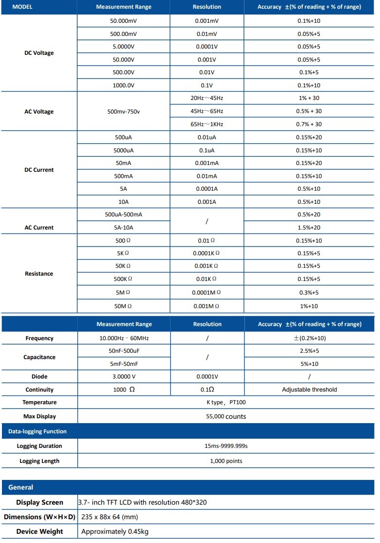Точность измерений постоянного тока до 0.05% + до 65считываний в сек + генерирование среднеквадратичных значений (True RMS) по переменному току / измерения тока + функция регистрации данных. Пользователь имеет возможность регистрировать данные во внутренней памяти прибора, после чего считывать и обрабатывать эти данные посредством компьютера + наличие двустрочного дисплея + поддержка SCPI + возможность использовать мощный и простой в применении интерфейс пользователя, благодаря чему присутствуют функции доступа, хранения и обработки данных через их воспроизведение в табличной форме + 3.7 дюймовый дисплей с высоким разрешением, точно воспроизводящим полученные результаты измерений.