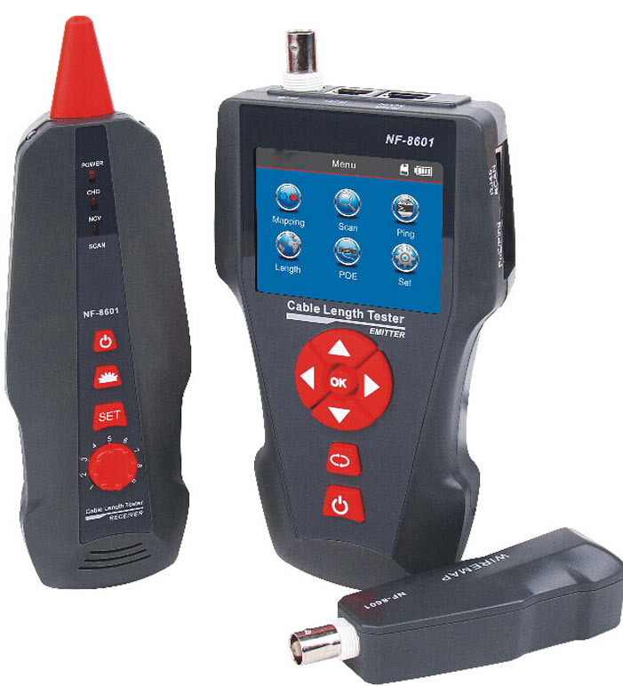 В модели NF-8601W в комплект входят восемь дистанционных датчиков для удобства работы и сокращения времени наладки сети. Предназначен для применения в таких областях, как телефонные системы, компьютерные сети и в других сетях медными/металлическими проводниками.
